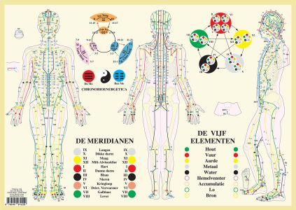 Een representatieve en kleurige afbeelding van de meridianen op het menselijk lichaam. Een voor- zij- en achteraanzicht, de meridianen hebben verschillende kleuren, afgeleid van de elementen. Zo ook de elementpunten op handen en armen, benen en voeten. Hemelvensterpunten, accumulatiepunten, lopunten en bronpunten zijn aangeduid. In tegenstelling to de voorgaande alleen in het Nederlands.