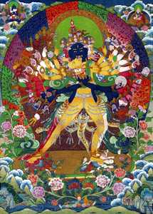 Dieses schöne Thangka (20. Jahrhundert) zeigt den blau-häutigen Kalachakra (Herr vom Rad der Zeit) in yab-yum (Vater-Mutter Vereinigung) mit der gold-häutigen Vishvamati (Mutter Aller Wesen). Beide haben eine Vielfalt von Armen und mehrere Köpfe, jedes mit 3 Augen - ein Symbol für die Tatsache dass sie auf allen Ebenen von Zeit und Raum und auf in allen Dimensionen des Seins wachsam und aktiv sind. |